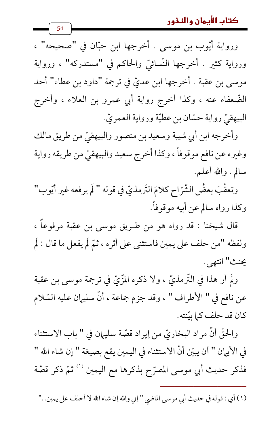 ولَم أر هذا في التّرمذيّ، ولا ذكره المزّيّ في ترجمة موسى بن عقبة عن نافع في " الأطراف "، وقد جزم جماعة , أنّ سليمان عليه السّلام كان قد حلف كما بيّنته.