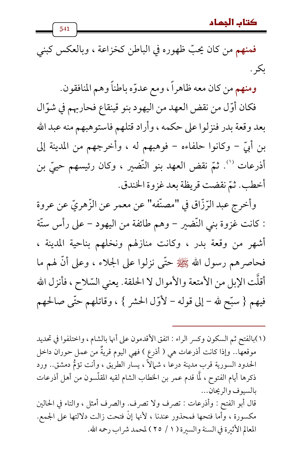 وأخرج عبد الرّزّاق في " مصنّفه " عن معمر عن الزّهريّ عن عروة: كانت غزوة بني النّضير - وهم طائفة من اليهود - على رأس ستّة أشهر من وقعة بدر، وكانت منازلهم ونخلهم بناحية المدينة، فحاصرهم رسول الله - صلى الله عليه وسلم - حتّى نزلوا على الجلاء , وعلى أنّ لهم ما أقلَّت الإبل من الأمتعة والأموال لا الحلقة. يعني السّلاح , فأنزل الله فيهم {سبّح لله - إلى قوله - لأوّل الحشر} , وقاتلهم حتّى صالحهم
