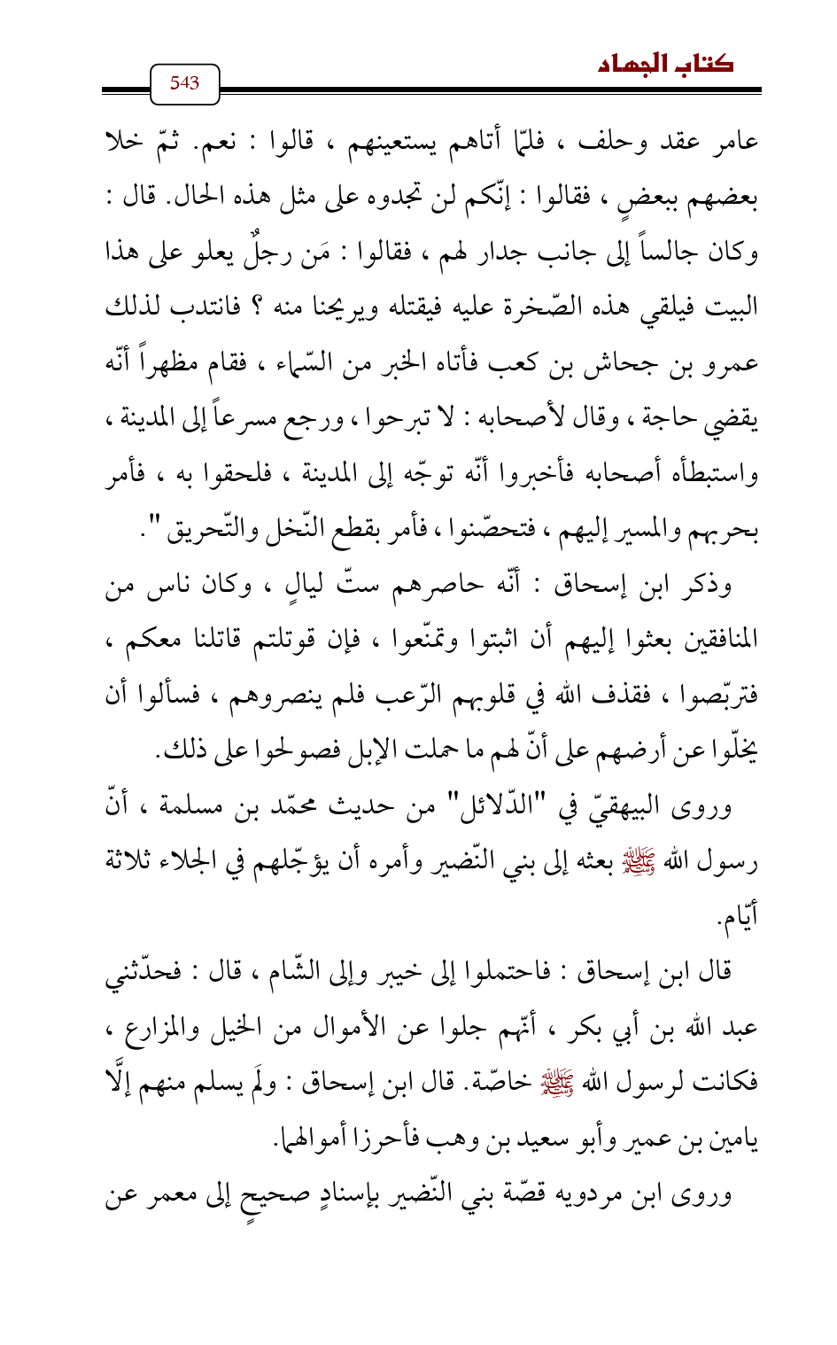 عامر عقد وحلف، فلمّا أتاهم يستعينهم , قالوا: نعم. ثمّ خلا بعضهم ببعضٍ , فقالوا: إنّكم لن تجدوه على مثل هذه الحال. قال: وكان جالساً إلى جانب جدار لهم، فقالوا: مَن رجلٌ يعلو على هذا البيت فيلقي هذه الصّخرة عليه فيقتله ويريحنا منه؟ فانتدب لذلك عمرو بن جحاش بن كعب فأتاه الخبر من السّماء , فقام مظهراً أنّه يقضي حاجة , وقال لأصحابه: لا تبرحوا، ورجع مسرعاً إلى المدينة، واستبطأه أصحابه فأخبروا أنّه توجّه إلى المدينة، فلحقوا به، فأمر بحربهم والمسير إليهم، فتحصّنوا، فأمر بقطع النّخل والتّحريق ".