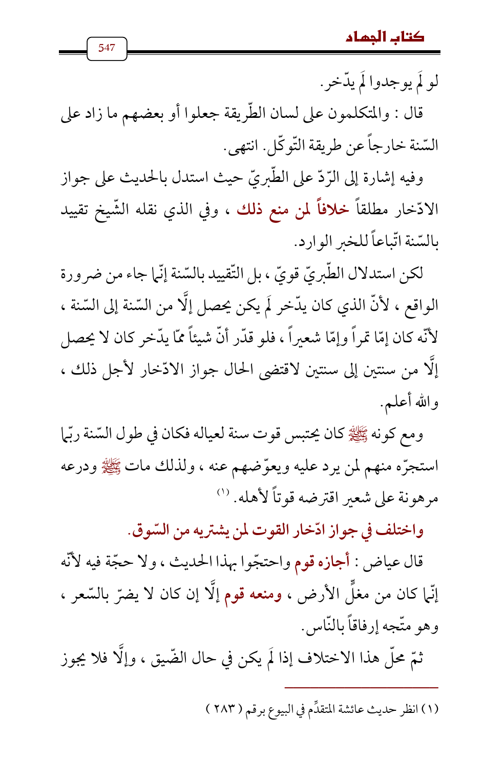 لكن استدلال الطّبريّ قويّ، بل التّقييد بالسّنة إنّما جاء من ضرورة الواقع , لأنّ الذي كان يدّخر لَم يكن يحصل إلَّا من السّنة إلى السّنة، لأنّه كان إمّا تمراً وإمّا شعيراً، فلو قدّر أنّ شيئاً ممّا يدّخر كان لا يحصل إلَّا من سنتين إلى سنتين لاقتضى الحال جواز الادّخار لأجل ذلك، والله أعلم.