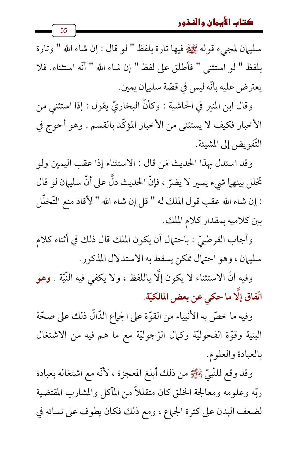 سليمان لمجيء قوله - صلى الله عليه وسلم - فيها تارة بلفظ " لو قال: إن شاء الله " وتارة بلفظ " لو استثنى " فأطلق على لفظ " إن شاء الله " أنّه استثناء. فلا يعترض عليه بأنّه ليس في قصّة سليمان يمين.