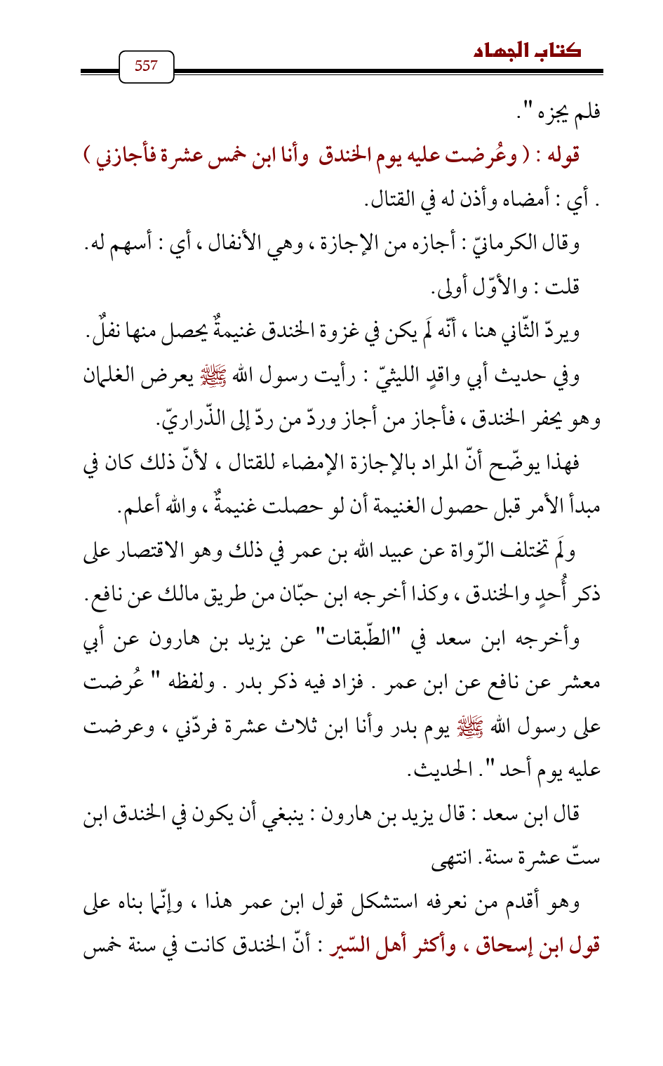 وهو أقدم من نعرفه استشكل قول ابن عمر هذا، وإنّما بناه على قول ابن إسحاق، وأكثر أهل السّير: أنّ الخندق كانت في سنة خمس