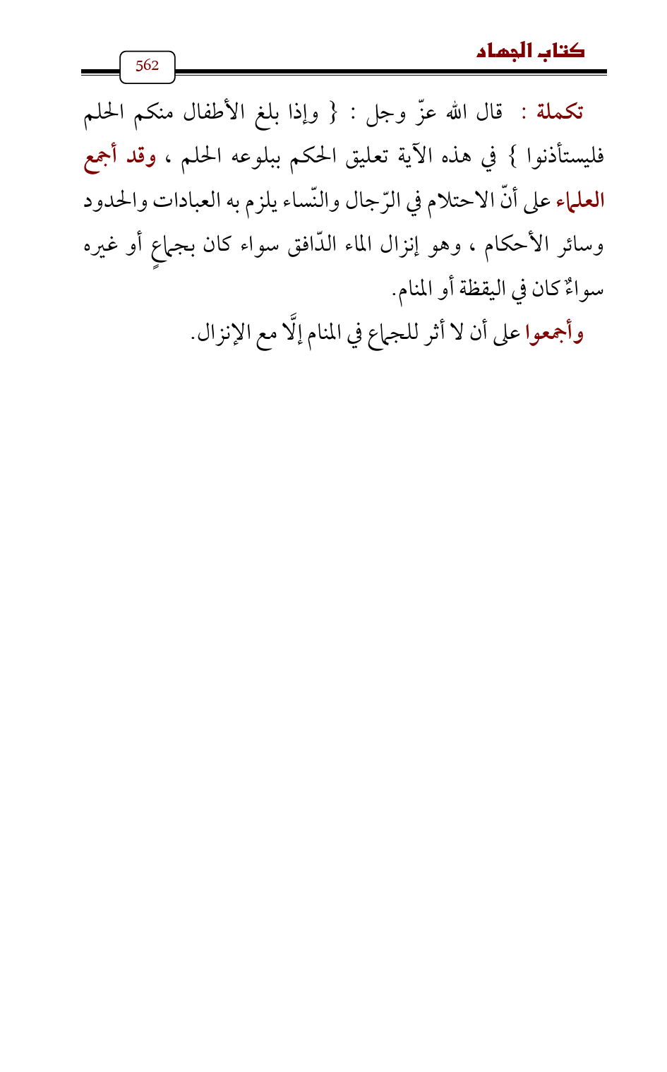 تكملة: قال الله عزّ وجل: {وإذا بلغ الأطفال منكم الحلم فليستأذنوا} في هذه الآية تعليق الحكم ببلوعه الحلم، وقد أجمع العلماء على أنّ الاحتلام في الرّجال والنّساء يلزم به العبادات والحدود وسائر الأحكام , وهو إنزال الماء الدّافق سواء كان بجماعٍ أو غيره سواءٌ كان في اليقظة أو المنام.
