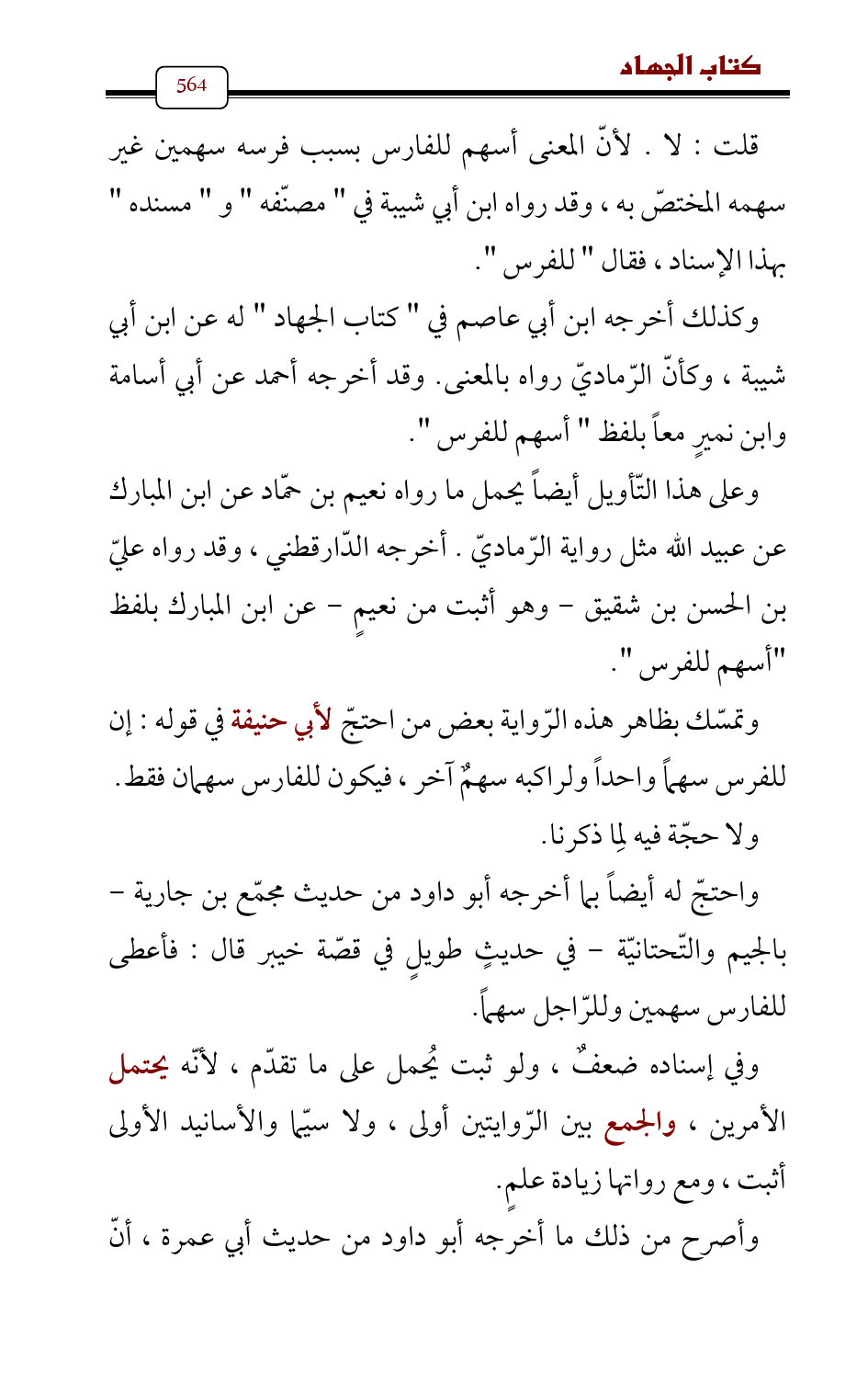 وكذلك أخرجه ابن أبي عاصم في " كتاب الجهاد " له عن ابن أبي شيبة , وكأنّ الرّماديّ رواه بالمعنى. وقد أخرجه أحمد عن أبي أسامة وابن نميرٍ معاً بلفظ " أسهم للفرس ".