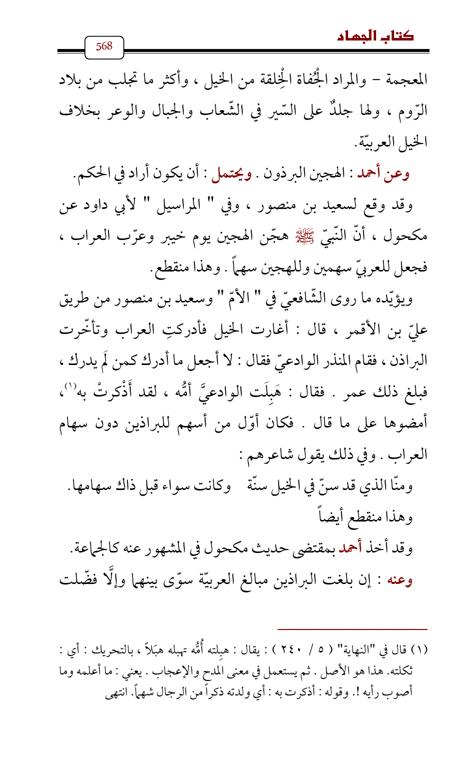 وقد وقع لسعيد بن منصور , وفي " المراسيل " لأبي داود عن مكحول , أنّ النّبيّ - صلى الله عليه وسلم - هجّن الهجين يوم خيبر وعرّب العراب , فجعل للعربيّ سهمين وللهجين سهماً. وهذا منقطع.