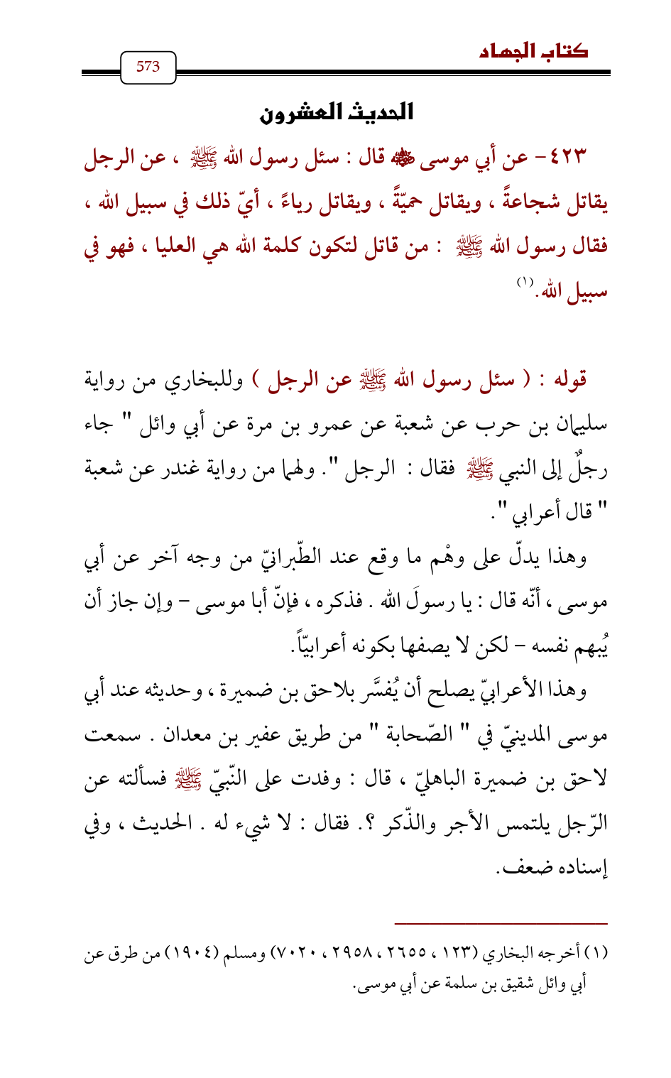 423 - عن أبي موسى - رضي الله عنه - قال: سئل رسول الله - صلى الله عليه وسلم -، عن الرجل يقاتل شجاعةً، ويقاتل حميّةً، ويقاتل رياءً، أيّ ذلك في سبيل الله، فقال رسول الله - صلى الله عليه وسلم -: من قاتل لتكون كلمة الله هي العليا، فهو في سبيل الله. (¬1)