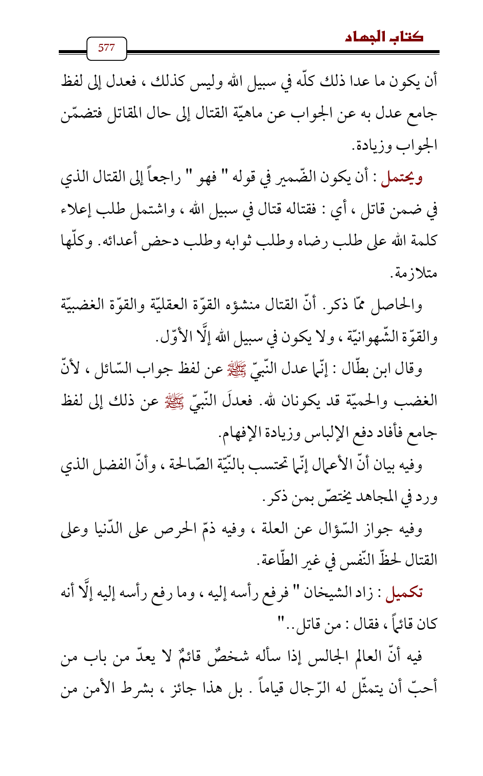أن يكون ما عدا ذلك كلّه في سبيل الله وليس كذلك، فعدل إلى لفظ جامع عدل به عن الجواب عن ماهيّة القتال إلى حال المقاتل فتضمّن الجواب وزيادة.