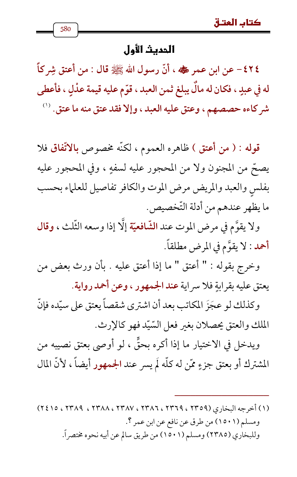 424 - عن ابن عمر - رضي الله عنه - , أنّ رسول الله - صلى الله عليه وسلم - قال: من أعتق شِركاً له في عبدٍ، فكان له مالٌ يبلغ ثمن العبد، قوّم عليه قيمة عدْلٍ، فأعطى شركاءه حصصهم، وعتق عليه العبد، وإلا فقد عتق منه ما عتق. (¬1)