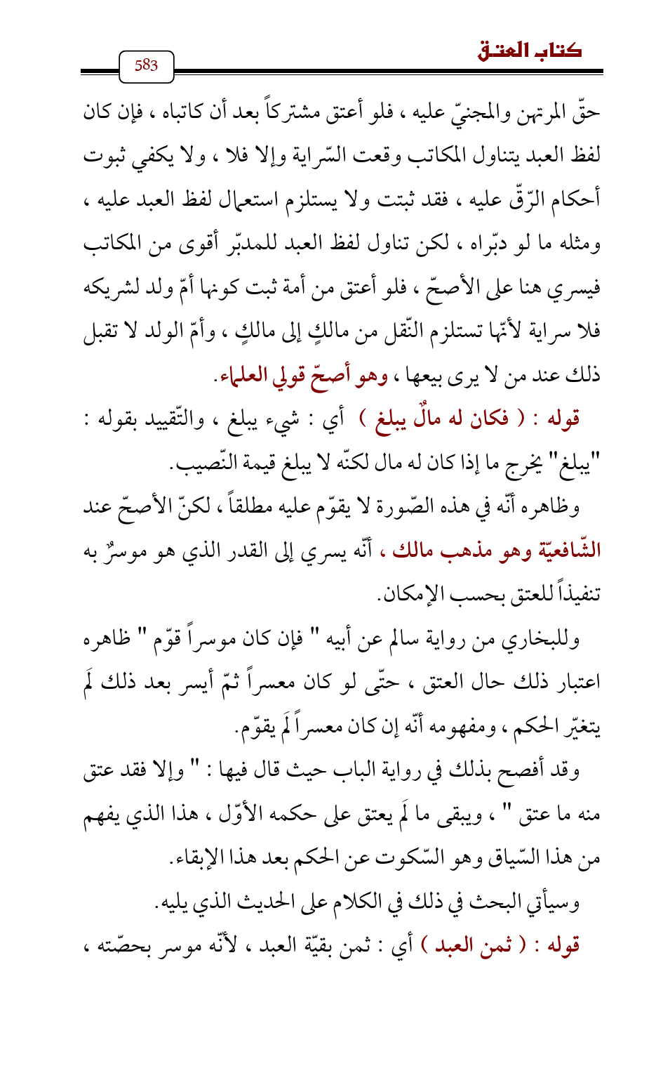 وقد أفصح بذلك في رواية الباب حيث قال فيها: " وإلا فقد عتق منه ما عتق " , ويبقى ما لَم يعتق على حكمه الأوّل، هذا الذي يفهم من هذا السّياق وهو السّكوت عن الحكم بعد هذا الإبقاء.
