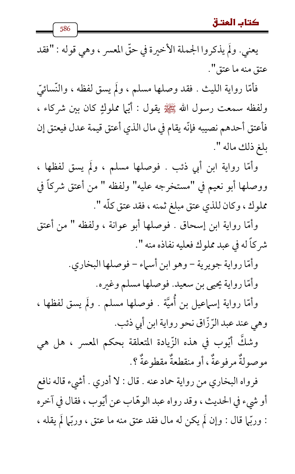 فرواه البخاري من رواية حماد عنه. قال: لا أدري. أشيء قاله نافع أو شيء في الحديث , وقد رواه عبد الوهّاب عن أيّوب , فقال في آخره: وربّما قال: وإن لَم يكن له مال فقد عتق منه ما عتق , وربّما لَم يقله،
