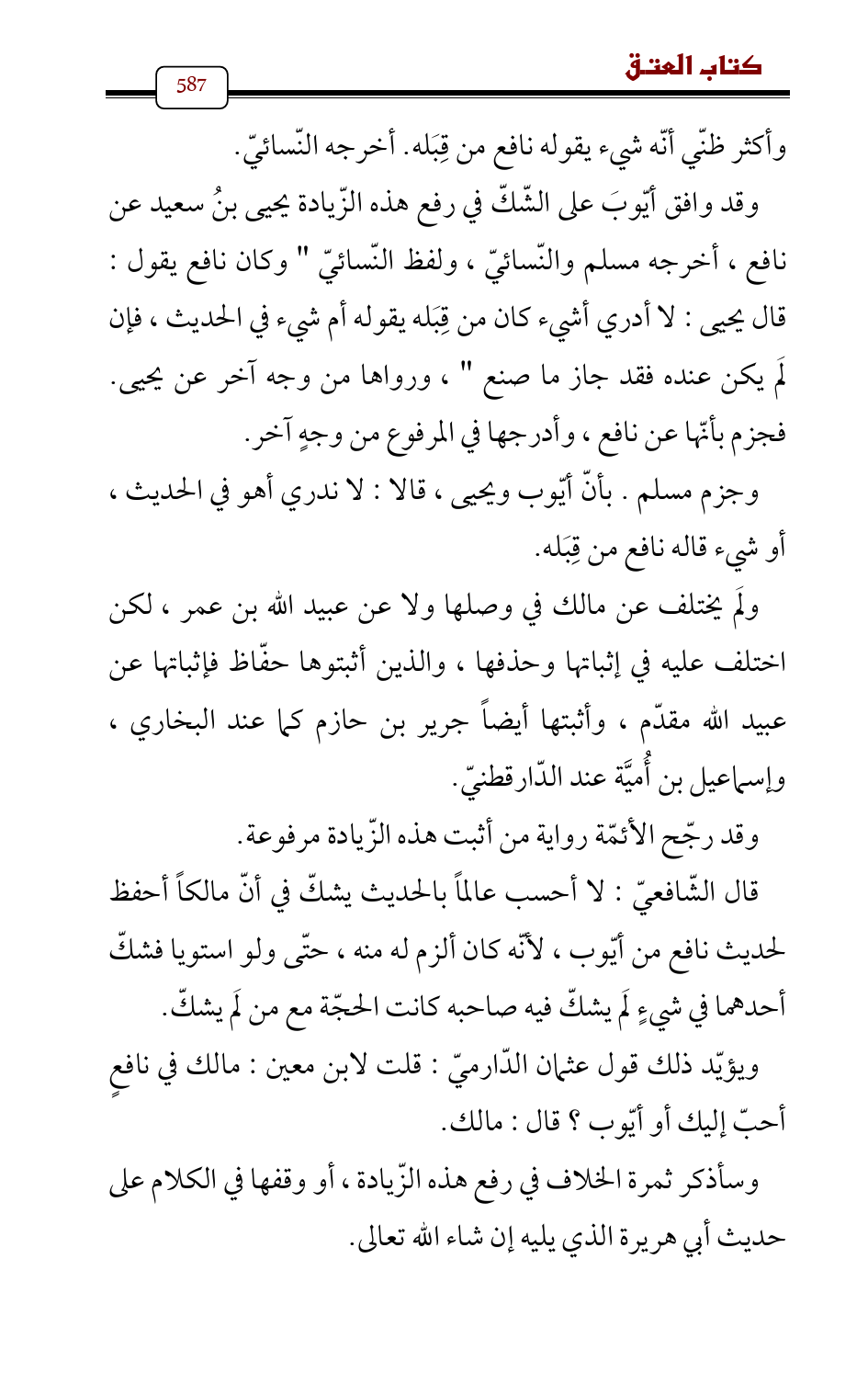 وقد وافق أيّوبَ على الشّكّ في رفع هذه الزّيادة يحيى بنُ سعيد عن نافع , أخرجه مسلم والنّسائيّ , ولفظ النّسائيّ " وكان نافع يقول: قال يحيى: لا أدري أشيء كان من قِبَله يقوله أم شيء في الحديث، فإن لَم يكن عنده فقد جاز ما صنع " , ورواها من وجه آخر عن يحيى. فجزم بأنّها عن نافع، وأدرجها في المرفوع من وجهٍ آخر.
