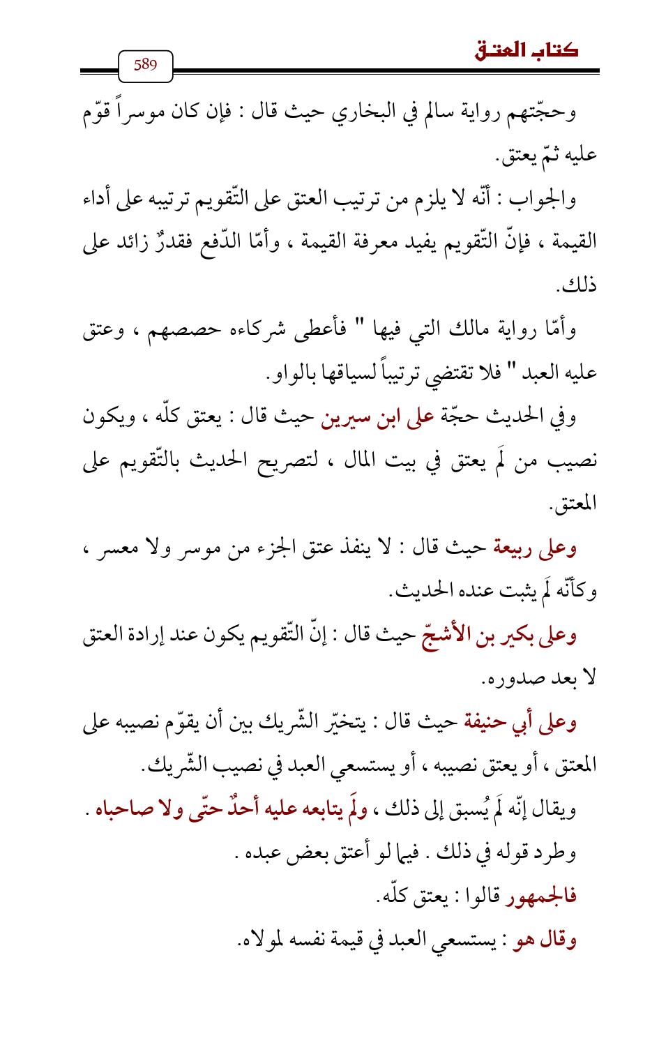وحجّتهم رواية سالم في البخاري حيث قال: فإن كان موسراً قوّم عليه ثمّ يعتق.