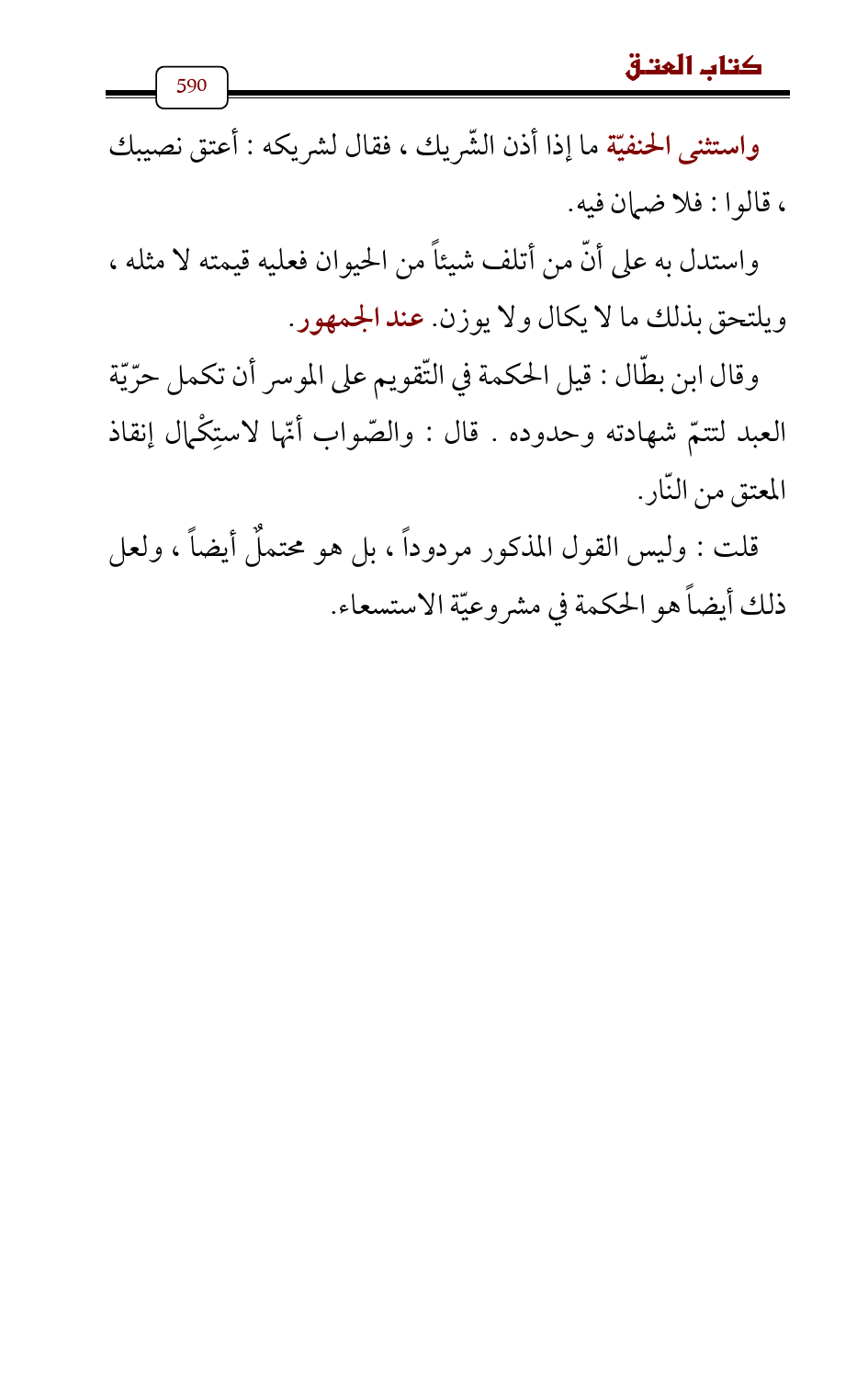 وقال ابن بطّال: قيل الحكمة في التّقويم على الموسر أن تكمل حرّيّة العبد لتتمّ شهادته وحدوده. قال: والصّواب أنّها لاستِكْمال إنقاذ المعتق من النّار.