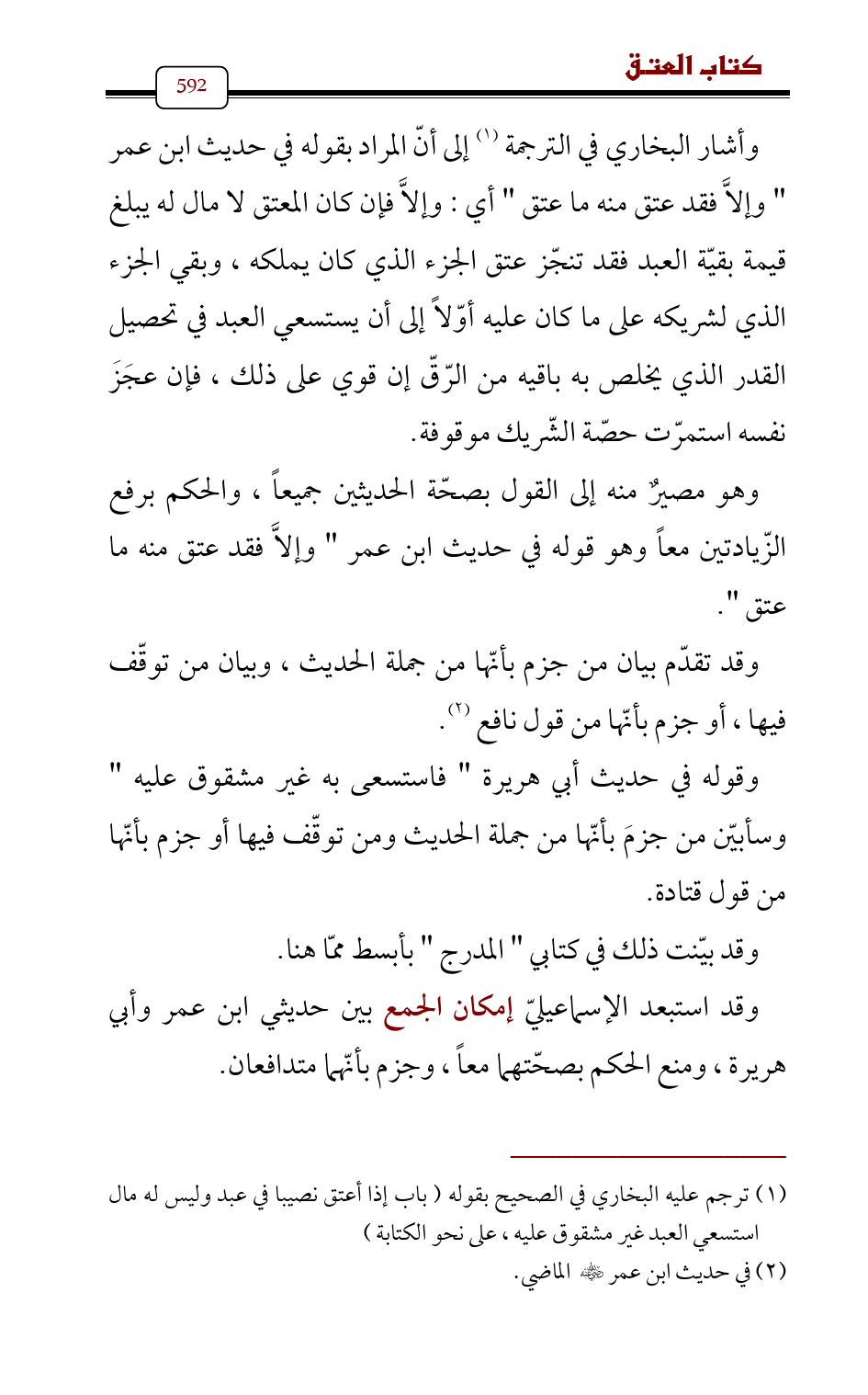 وهو مصيرٌ منه إلى القول بصحّة الحديثين جميعاً , والحكم برفع الزّيادتين معاً وهو قوله في حديث ابن عمر " وإلاَّ فقد عتق منه ما عتق ".