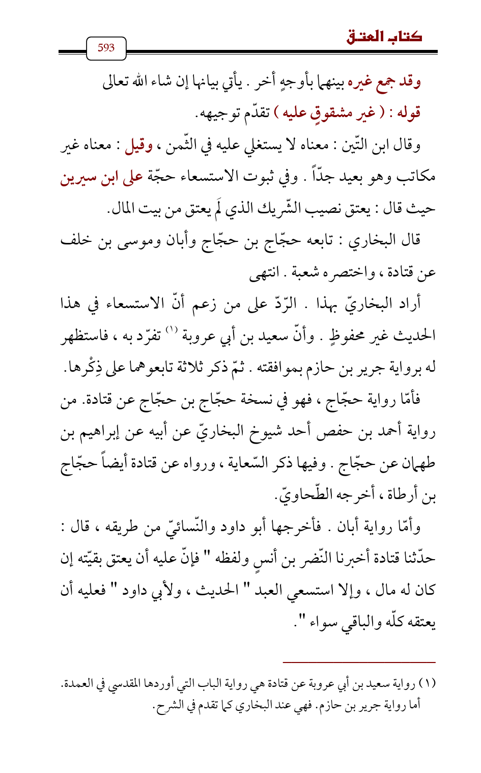 (¬1) رواية سعيد بن أبي عروبة عن قتادة هي رواية الباب التي أوردها المقدسي في العمدة. أما رواية جرير بن حازم. فهي عند البخاري كما تقدم في الشرح.