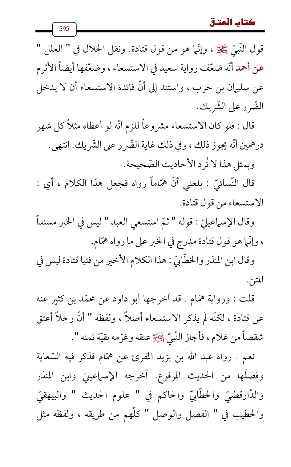 قول النّبيّ - صلى الله عليه وسلم -، وإنّما هو من قول قتادة. ونقل الخلال في " العلل " عن أحمد أنّه ضعّف رواية سعيد في الاستسعاء، وضعّفها أيضاً الأثرم عن سليمان بن حرب، واستند إلى أنّ فائدة الاستسعاء أن لا يدخل الضّرر على الشّريك.