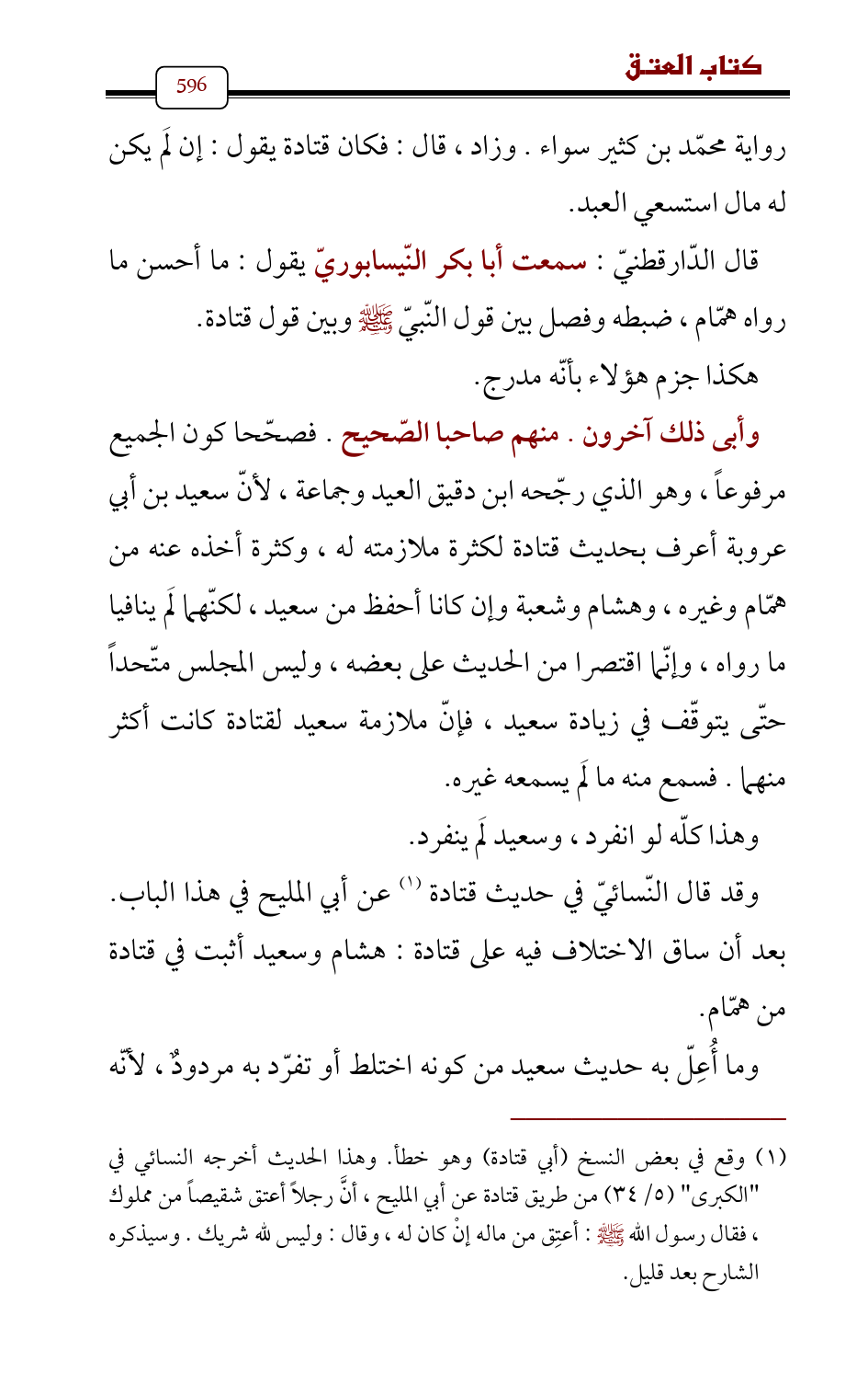 وأبى ذلك آخرون. منهم صاحبا الصّحيح. فصحّحا كون الجميع مرفوعاً، وهو الذي رجّحه ابن دقيق العيد وجماعة، لأنّ سعيد بن أبي عروبة أعرف بحديث قتادة لكثرة ملازمته له , وكثرة أخذه عنه من همّام وغيره، وهشام وشعبة وإن كانا أحفظ من سعيد , لكنّهما لَم ينافيا ما رواه، وإنّما اقتصرا من الحديث على بعضه، وليس المجلس متّحداً حتّى يتوقّف في زيادة سعيد، فإنّ ملازمة سعيد لقتادة كانت أكثر منهما. فسمع منه ما لَم يسمعه غيره.