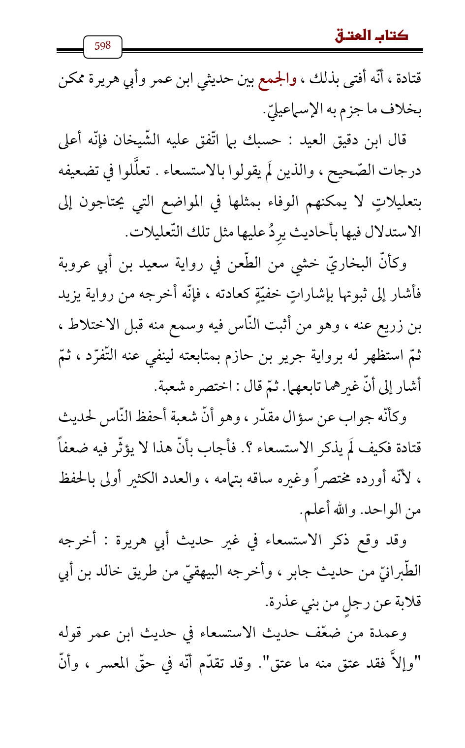 وعمدة من ضعّف حديث الاستسعاء في حديث ابن عمر قوله " وإلاَّ فقد عتق منه ما عتق ". وقد تقدّم أنّه في حقّ المعسر , وأنّ