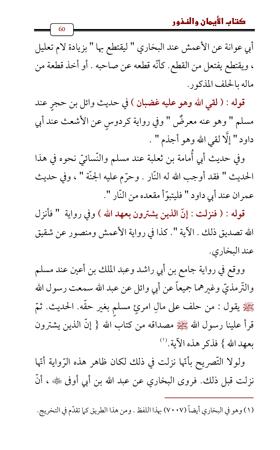 ووقع في رواية جامع بن أبي راشد وعبد الملك بن أعين عند مسلم والتّرمذيّ وغيرهما جميعاً عن أبي وائل عن عبد الله سمعت رسول الله - صلى الله عليه وسلم - يقول: من حلف على مالِ امرئٍ مسلمٍ بغير حقّه. الحديث. ثمّ قرأ علينا رسول الله - صلى الله عليه وسلم - مصداقه من كتاب الله {إنّ الذين يشترون بعهد الله} فذكر هذه الآية. (¬1)