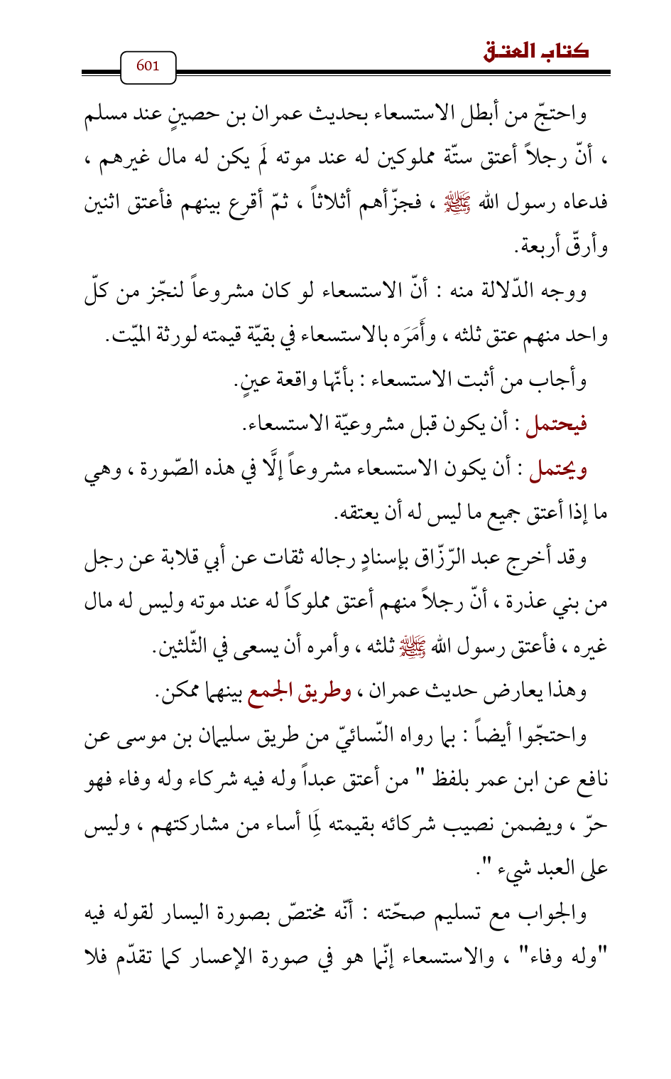 واحتجّ من أبطل الاستسعاء بحديث عمران بن حصينٍ عند مسلم , أنّ رجلاً أعتق ستّة مملوكين له عند موته لَم يكن له مال غيرهم، فدعاه رسول الله - صلى الله عليه وسلم - , فجزّأهم أثلاثاً , ثمّ أقرع بينهم فأعتق اثنين وأرقّ أربعة.