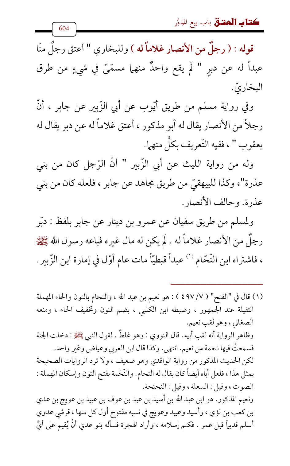 ولمسلم من طريق سفيان عن عمرو بن دينار عن جابر بلفظ: دبّر رجلٌ من الأنصار غلاماً له. لَم يكن له مال غيره فباعه رسول الله - صلى الله عليه وسلم -، فاشتراه ابن النّحّام (¬1) عبداً قبطيّاً مات عام أوّل في إمارة ابن الزّبير.
