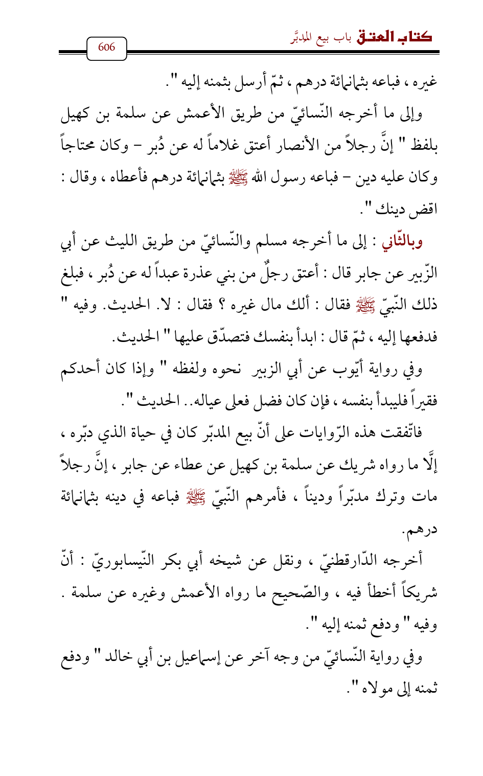 وإلى ما أخرجه النّسائيّ من طريق الأعمش عن سلمة بن كهيل بلفظ " إنَّ رجلاً من الأنصار أعتق غلاماً له عن دُبر - وكان محتاجاً وكان عليه دين - فباعه رسول الله - صلى الله عليه وسلم - بثمانمائة درهم فأعطاه , وقال: اقض دينك ".