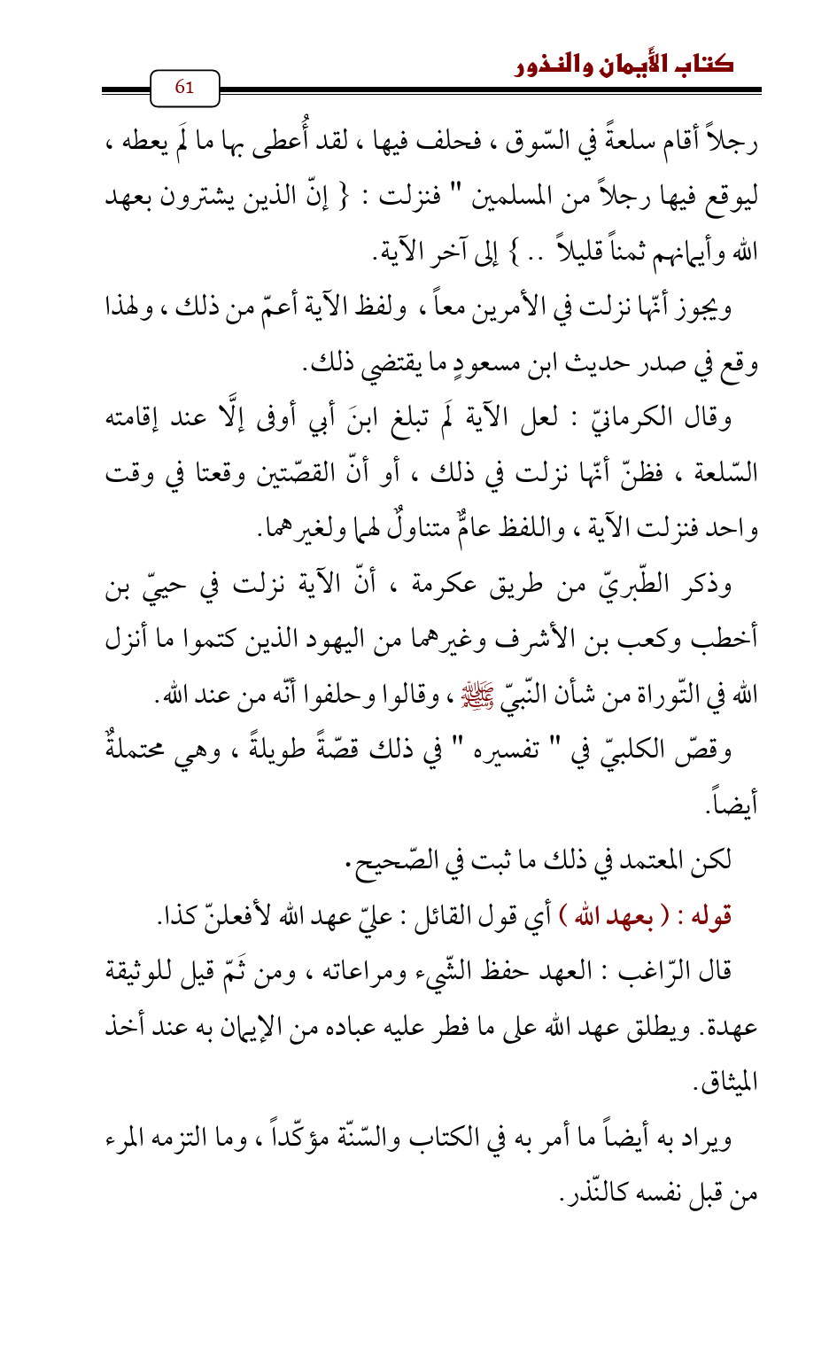 رجلاً أقام سلعةً في السّوق، فحلف فيها، لقد أُعطى بها ما لَم يعطه، ليوقع فيها رجلاً من المسلمين " فنزلت: {إنّ الذين يشترون بعهد الله وأيمانهم ثمناً قليلاً ..} إلى آخر الآية.