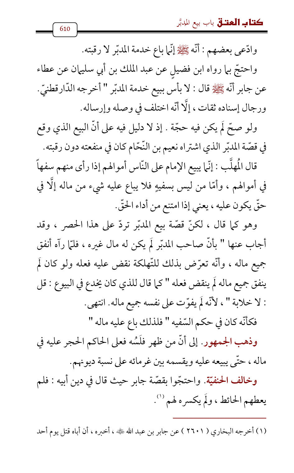 وهو كما قال , لكنّ قصّة بيع المدبّر تردّ على هذا الحصر , وقد أجاب عنها " بأنّ صاحب المدبّر لَم يكن له مال غيره، فلمّا رآه أنفق جميع ماله، وأنّه تعرّض بذلك للتّهلكة نقض عليه فعله ولو كان لَم ينفق جميع ماله لَم ينقض فعله " كما قال للذي كان يخدع في البيوع: قل: لا خلابة " , لأنّه لَم يفوّت على نفسه جميع ماله. انتهى.