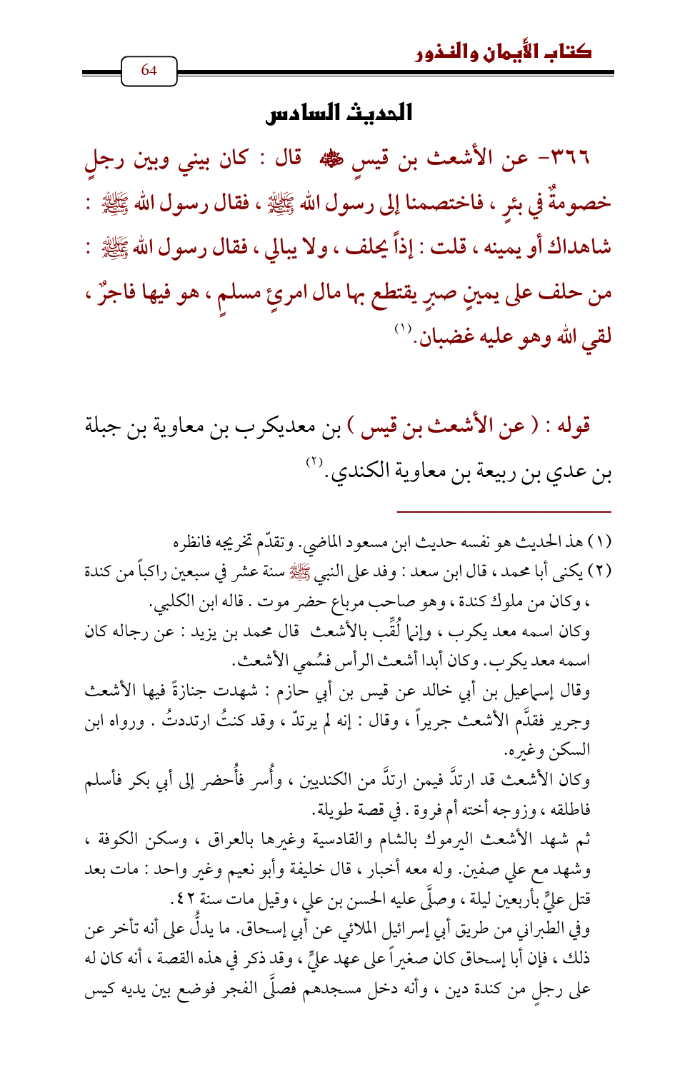 366 - عن الأشعث بن قيسٍ - رضي الله عنه - قال: كان بيني وبين رجلٍ خصومةٌ في بئرٍ، فاختصمنا إلى رسول الله - صلى الله عليه وسلم - , فقال رسول الله - صلى الله عليه وسلم -: شاهداك أو يمينه، قلت: إذاً يحلف، ولا يبالي، فقال رسول الله - صلى الله عليه وسلم -: من حلف على يمينٍ صبرٍ يقتطع بها مال امرئٍ مسلمٍ، هو فيها فاجرٌ، لقي الله وهو عليه غضبان. (¬1)