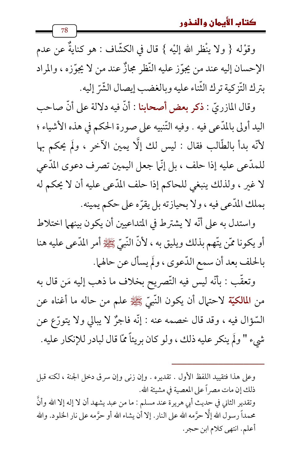 وقوْله {ولا ينْظر الله إليْه} قال في الكشّاف: هو كنايةٌ عن عدم الإحسان إليه عند من يجوّز عليه النّظر مجازٌ عند من لا يجوّزه , والمراد بترك التّزكية ترك الثّناء عليه وبالغضب إيصال الشّرّ إليه.
