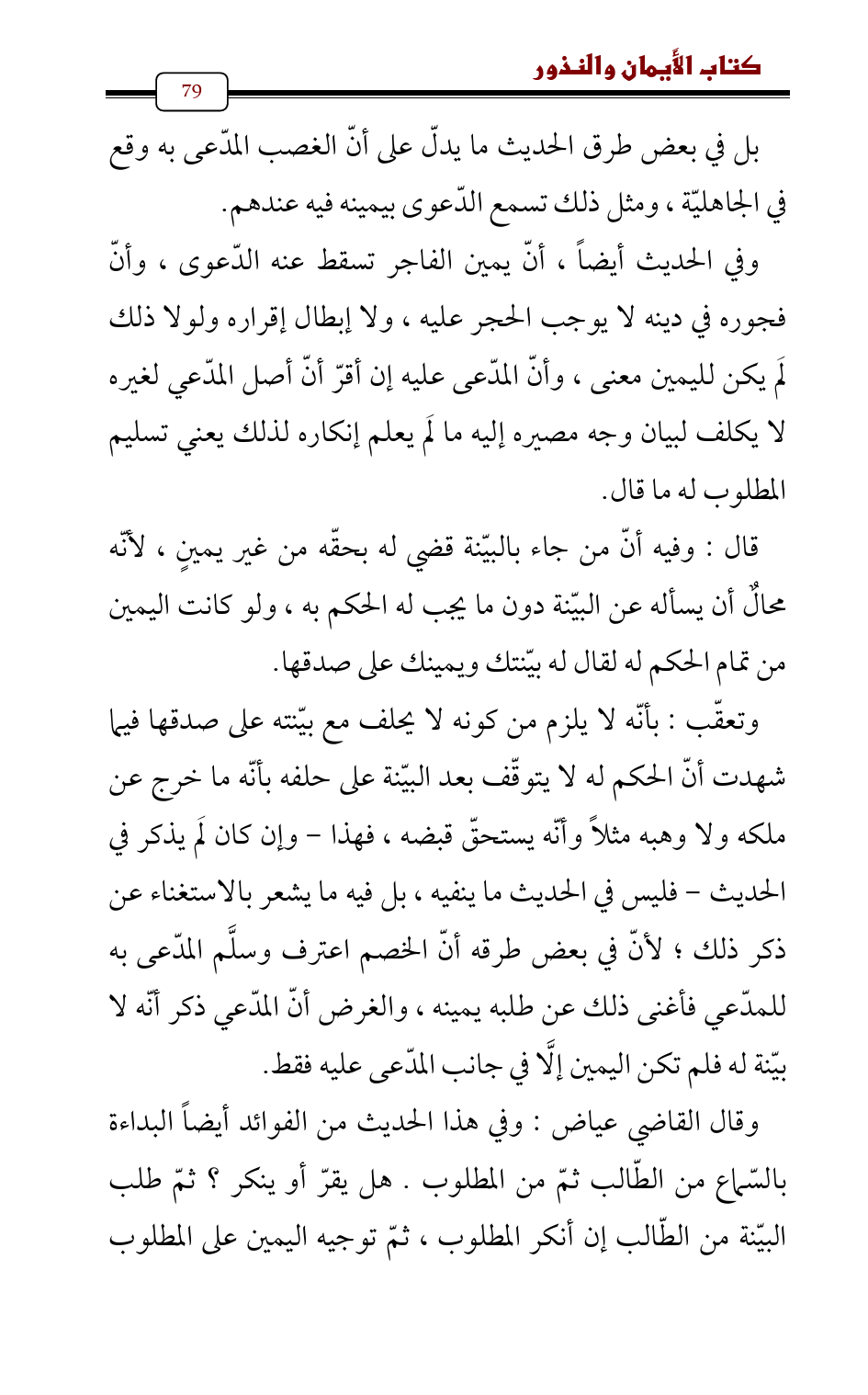وفي الحديث أيضاً , أنّ يمين الفاجر تسقط عنه الدّعوى، وأنّ فجوره في دينه لا يوجب الحجر عليه، ولا إبطال إقراره ولولا ذلك لَم يكن لليمين معنى، وأنّ المدّعى عليه إن أقرّ أنّ أصل المدّعي لغيره لا يكلف لبيان وجه مصيره إليه ما لَم يعلم إنكاره لذلك يعني تسليم المطلوب له ما قال.