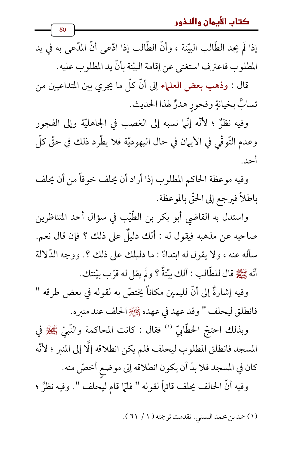 وبذلك احتجّ الخطّابيّ (¬1) فقال: كانت المحاكمة والنّبيّ - صلى الله عليه وسلم - في المسجد فانطلق المطلوب ليحلف فلم يكن انطلاقه إلَّا إلى المنبر؛ لأنّه كان في المسجد فلا بدّ أن يكون انطلاقه إلى موضعٍ أخصّ منه.