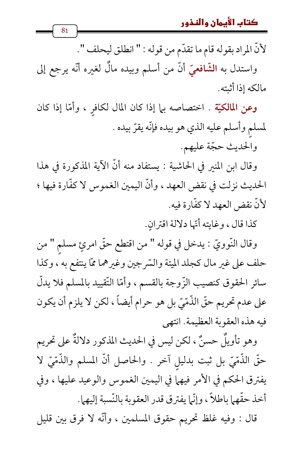 وهو تأويلٌ حسنٌ , لكن ليس في الحديث المذكور دلالةٌ على تحريم حقّ الذّمّيّ بل ثبت بدليلٍ آخر. والحاصل أنّ المسلم والذّمّيّ لا يفترق الحكم في الأمر فيهما في اليمين الغموس والوعيد عليها، وفي أخذ حقّهما باطلاً، وإنّما يفترق قدر العقوبة بالنّسبة إليهما.