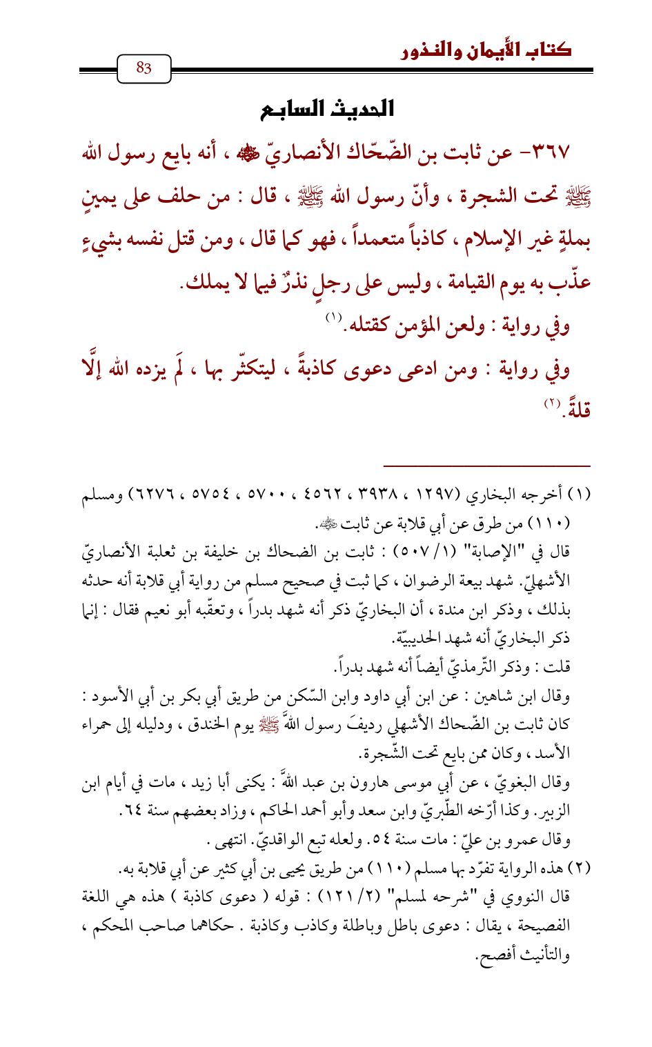 367 - عن ثابت بن الضّحّاك الأنصاريّ - رضي الله عنه - , أنه بايع رسول الله - صلى الله عليه وسلم - تحت الشجرة، وأنّ رسول الله - صلى الله عليه وسلم - , قال: من حلف على يمينٍ بملةٍ غير الإسلام، كاذباً متعمداً، فهو كما قال، ومن قتل نفسه بشيءٍ عذّب به يوم القيامة، وليس على رجلٍ نذرٌ فيما لا يملك.