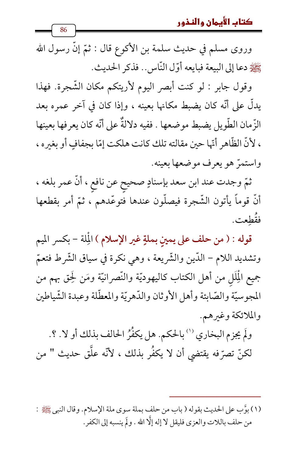 (¬1) بوَّب على الحديث بقوله (باب من حلف بملة سوى ملة الإسلام. وقال النبى - صلى الله عليه وسلم -: من حلف باللات والعزى فليقل لا إله إلَّا الله. ولَم ينسبه إلى الكفر.