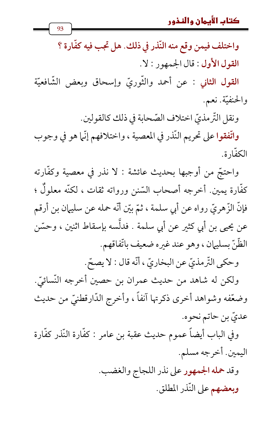 واحتجّ من أوجبها بحديث عائشة: لا نذر في معصية وكفّارته كفّارة يمين. أخرجه أصحاب السّنن ورواته ثقات، لكنّه معلولٌ؛ فإنّ الزّهريّ رواه عن أبي سلمة , ثمّ بيّن أنّه حمله عن سليمان بن أرقم عن يحيى بن أبي كثير عن أبي سلمة. فدلَّسه بإسقاط اثنين، وحسّن الظّنّ بسليمان , وهو عند غيره ضعيف باتّفاقهم.