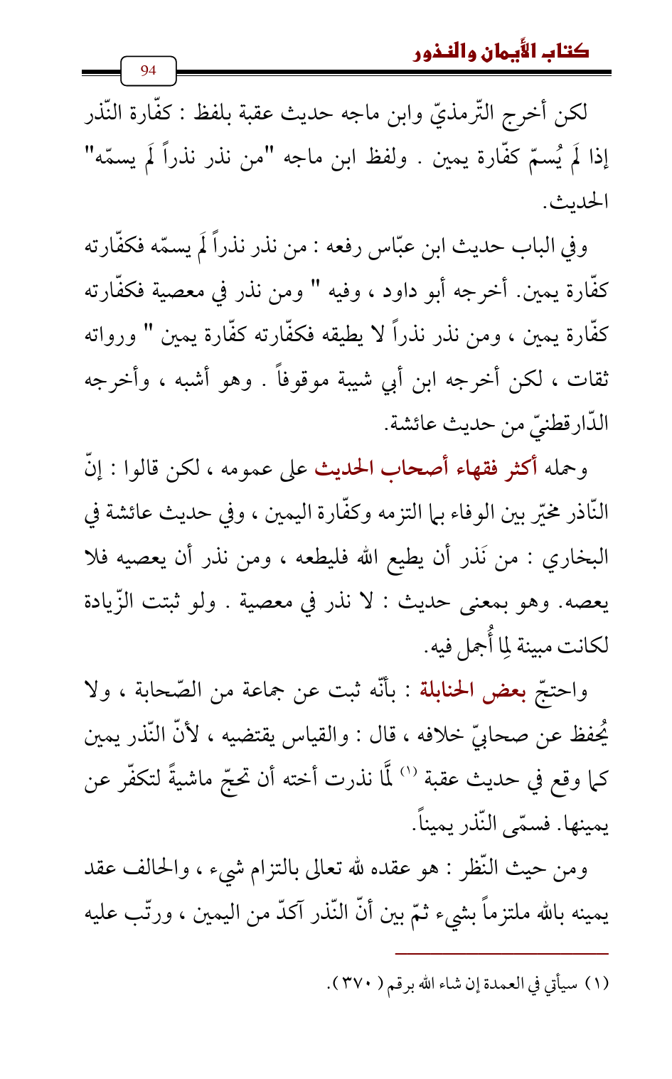 وحمله أكثر فقهاء أصحاب الحديث على عمومه , لكن قالوا: إنّ النّاذر مخيّر بين الوفاء بما التزمه وكفّارة اليمين، وفي حديث عائشة في البخاري: من نَذر أن يطيع الله فليطعه، ومن نذر أن يعصيه فلا يعصه. وهو بمعنى حديث: لا نذر في معصية. ولو ثبتت الزّيادة لكانت مبينة لِما أُجمل فيه.
