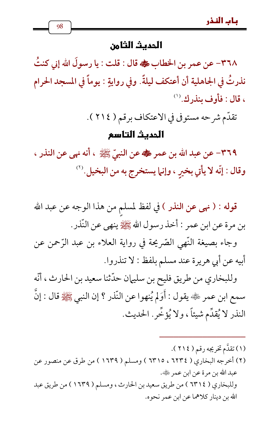 369 - عن عبد الله بن عمر - رضي الله عنه - عن النبيّ - صلى الله عليه وسلم - , أنه نهى عن النذر، وقال: إنّه لا يأتي بخيرٍ، وإنما يستخرج به من البخيل. (¬2)