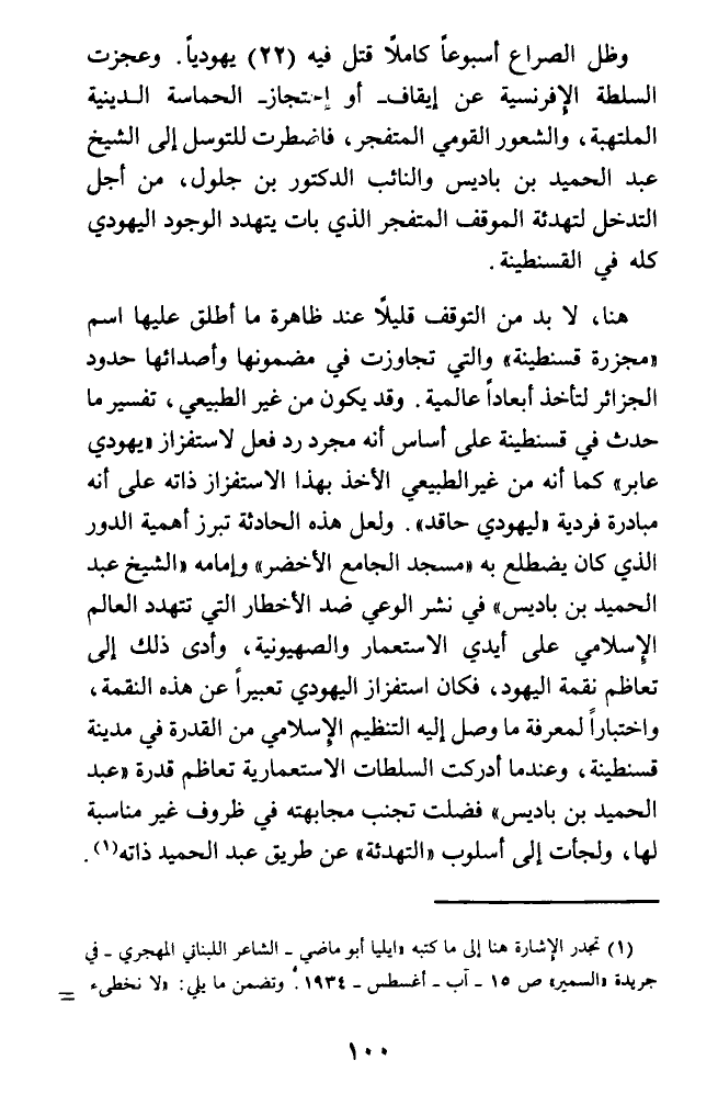 هنا، لا بد من التوقف قليلا عند ظاهرة ما أطلق عليها اسم (مجزرة قسنطينة) والتي تجاوزات في مضمونها وأصدائها حدود الجزائر لتأخذ أبعادا عالمية. وقد يكون من غير الطبيعي، تفسير ما حدث في قسنطينة على أساس أنه مجرد رد فعل لاستفزاز (يهودي عابر) كما أنه من غير الطبيعي الأخذ بهذا الاستفزاز ذاته على أنه مبادرة فردية (ليهودي حاقد). ولعل هذه الحادثة تبرز أهمية الدور الذي كان يضطلع به (مسجد الجامع الأخضر) وإمامه (الشيخ عبد الحميد بن باديس) في نشر الوعي ضد الأخطار التي تتهدد العالم الإسلامي على أيدي الاستعمار والصهيونية، وأدى ذلك إلى تعاظم نقمة اليهود، فكان استفزاز اليهودي تعبيرا عن هذه النقمة، واختبارا لمعرفة ما وصل إليه التنظيم الإسلامي من القدرة في مدينة قسنطينة، وعندما أدركت السلطات الاستعمارية تعاظم قدرة (عبد الحميد بن باديس) فضلت تجنب مجابهته في ظروف غير مناسبة لها، ولجأت إلى أسلوب (التهدئة) عن طريق عبد الحميد ذاته (¬1).