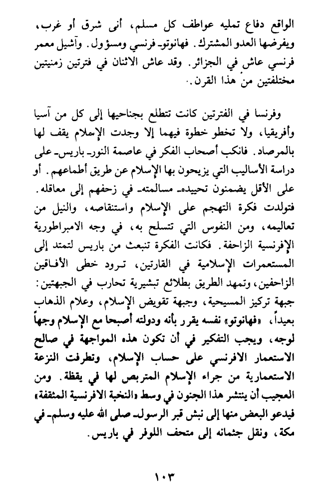 وفرنسا في الفترتين كانت تتطلع بجناحيها إلى كل من آسيا وأفريقيا، ولا تخطو خطوة فيهما إلا وجدت الإسلام يقف لها بالمرصاد. فانكب أصحاب الفكر في عاصمة النور - باريس - على دراسة الأساليب التي يزيحون بها الإسلام عن طريق أطماعهم. أو على الأقل يضمنون تحييده - مسالمته - في زحفهم إلى معاقله. فتولدت فكرة التهجم على الإسلام واستنقاصه، والنيل من تعاليمه، ومن النفوس التي تتسلح به، في وجه الامبراطورية الإفرنسية الزاحفة. فكانت الفكرة تنبعث من باريس لتمتد إلى المستعمرات الإسلامية في القارتين، ترود خطى الأفاقين الزاحفين، وتمهد الطريق بطلائع تبشيرية تحارب في الجبهتين: جبهة تركيز المسيحية، وجبهة تقويض الإسلام، وعلام الذهاب بعيدا، (فهانوتو) نفسه يقرر بأنه ودولته أصبحا مع الإسلام وجها لوجه، ويجب التفكير في أن تكون هذه المواجهة في صالح الاستعمار الإفرنسي على حساب الإسلام، وتطرفت النزعة الاستعمارية من جراء الإسلام المتربص لها في يقظة. ومن العجيب أن ينتشر هذا الجنون في وسط (النخبة الإفرنسية المثقفة) فيدعو البعض منها إلى نبش قبر الرسول - صلى الله عليه وسلم - في مكة، ونقل جثمانه إلى متحف اللوفر في باريس.