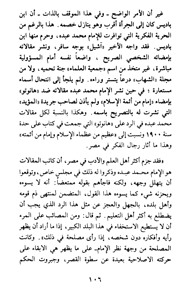 غير أن الأمر الواضح - وفي هذا الموقف بالذات - أن ابن باديس كان إلى الجرأة أقرب وهو ينازل خصمه. هذا بالرغم من الحرية الفكرية التي توافرت للإمام محمد عبده، وحرم منها ابن باديس. فقد واجه الأخير (آشيل) بوجه سافر، ونشر مقالاته بإمضائه الشخصي الصريح، واضعا نفسه أمام المسؤولية مباشرة، غير متخذ من اسم (جمعية العلماء) جنة تحميه، ولا من مجلة (الشهاب) درعا يتستر وراءه. ولم يلجأ إلى انتحال أسماء مستعارة؛ في حين نشر الإمام محمد عبده مقالاته ضد (هانوتو) بإمضاء (إمام من أئمة الإسلام) ولم يأذن لصاحب جريدة (المؤيد) التي نشرت له بالتصريح باسمه. وهكذا بالنسبة لكل مقالات محمد عبده في الرد على (هانوتو) التي جمعت في كتاب على حدة ستة 1900 ونسبت إلى (عظيم من عظماء الإسلام وإمام من أئمته) وهذا ما أشار رجال الفكر في مصر.