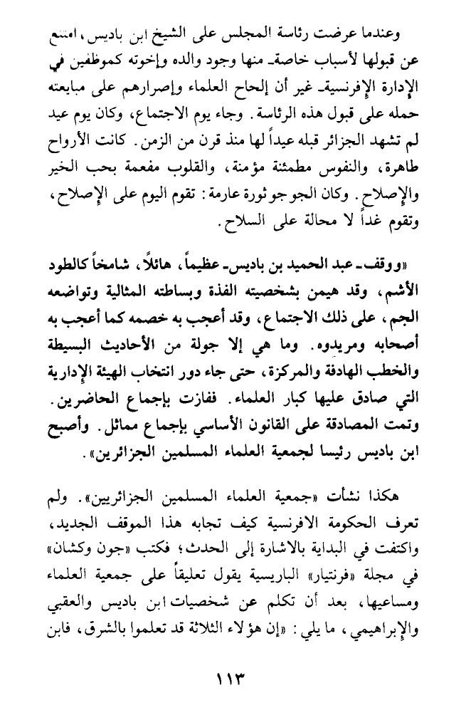 (ووقف - عبد الحميد بن باديس - عظيما، هائلا، شامخا كالطود الأشم، وقد هيمن بشخصيته الفذة وبساطته المثالية وتواضعه الجم، على ذلك الاجتماع، وقد أعجب به خصمه كما أعجب به أصحابه ومريدوه. وما هي إلا جولة من الأحاديث البسيطة والخطب الهادفة والمركزة، حتى جاء دور انتخاب الهيئة الإدارية التي صادق عليها كبار العلماء. ففازت بإجماع الحاضرين. وتمت المصادقة على القانون الأساسي بإجماع مماثل. وأصح ابن باديس رئيسا لجمعية العلماء المسلمين الجزائريين).