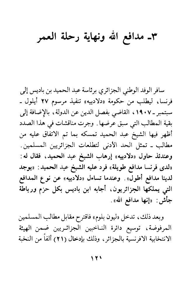 سافر الوفد الوطني الجزائري برئاسة عبد الحميد بن باديس إلى فرنسا، ليطلب من حكومة (دلادييه) تنفيذ مرسوم 27 أيلول - سبتمبر - 1907، القاضي بفصل الدين عن الدولة، بالإضافة إلى بقية المطالب التي سبق عرضها. وجرت مناقشات في هذا الصدد أظهر فيها الشيخ عبد الحميد تمسكه بما تم الاتفاق عليه من مطالب - تمثل الحد الأدنى لتطلعات الجزائريين المسلمين. وعندئذ حاول (دلاديه) إرهاب الشيخ عبد الحميد، فقال له: (لدى فرنسا مدافع طويلة) فرد عليه الشيخ عبد الحميد: (يوجد لدينا مدافع أطول). وعندما تساءل (دلادييه) عن نوع المدافع ااتي يملكها الجزائريون، أجابه ابن باديس بكل حزم ورباطة جأش: (إنها مدافع الله).