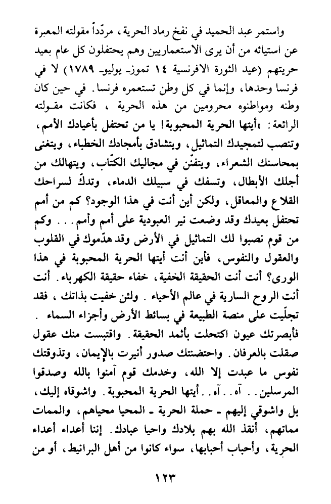 واستمر عبد الحميد في نفخ رماد الحرية، مرددا مقولته المعبرة عن استيائه من أن يرى الاستعماريين وهم يحتفلون كل عام بعيد حريتهم (عيد الثورة الإفرنسية 14 تموز - يوليو 1789) لا في فرنسا وحدها، وإنما في كل وطن تستعمره فرنسا. في حين كان وطنه ومواطنوه محرومين من هذه الحرية، فكانت مقولته الرائعة: (أيتها الحرية المحبوبة! يا من تحتفل بأعيادك الأمم، وتنصب لتمجيدك التماثيل، ويتشادق بأمجادك الخطباء، ويتغنى بمحاسنك الشعراء، ويتفنن في مجاليك الكتاب، ويتهالك من أجلك الأبطال، وتسفك في سبيلك الدماء، وتدك لسراحك القلاع والمعاقل، ولكن أين أنت في هذا الوجود؟ كم من أمم تحتفل بعيدك وقد وضعت نير العبودية على أمم وأمم ... وكم من قوم نصبوا لك التماثيل في الأرض وقد هدموك في القلوب والعقول والنفوس، فأين أنت أيتها الحرية المحبوبة في هذا الورى؟ أنت أنت الحقيقة الخفية، خفاء حقيقة الكهرباء. أنت أنت الروح السارية في عالم الأحياء. ولئن خفيت بذاتك، فقد تجليت على منصة الطبيعة في بسائط الأرض وأجزاء السماء.