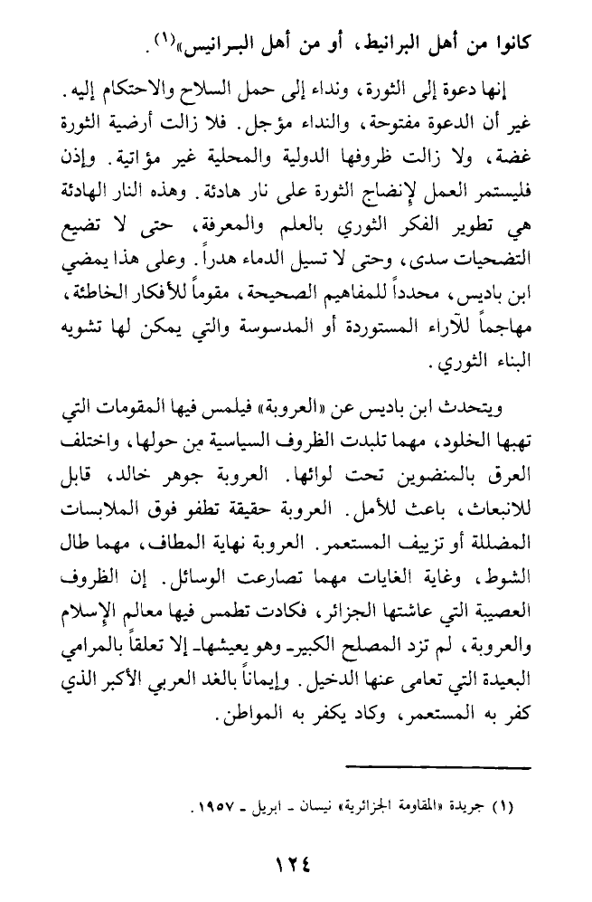 ويتحدث ابن باديس عن (العروبة) فيلمس فيها المقومات التي تهبها الخلود، مهما تلبدت الظروف السياسية من حولها، واختلف العرق بالمنضوين تحت لوائها. العروبة جوهر خالد، قابل للانبعاث، باعث للأمل. العروبة حقيقة تطفو فوق الملابسات المضللة أو تزييف المستعمر. العروبة نهاية المطاف، مهما طال الشوط، وغاية الغايات مهما تصارعت الوسائل. إن الظروف العصيبة التي عاشتها الجزائر، فكادت تطمس فيها معالم الإسلام والعروبة، لم تزد المصلح الكبير - وهو يعيشها - إلا تعلقا بالمرامي البعيدة التي تعامى عنها الدخيل. وإيمانا بالغد العربي الأكبر الذي كفر به المستعمر، وكاد يكفر به المواطن.