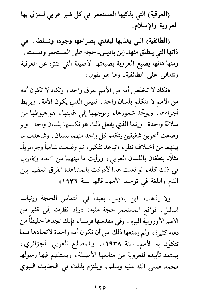 (الطائفية) التي يغذيها ليغذي بصراعها وجوده وتسلطه، هي ذاتها التي ينطلق منها - ابن باديس - حجة على المستعمر وفلسفته، ومنها ذاتها يصبغ العروبة بصبغتها الأصيلة التي تتنزه عن العرقية وتتعالى على الطائفية - وها هو يقول: