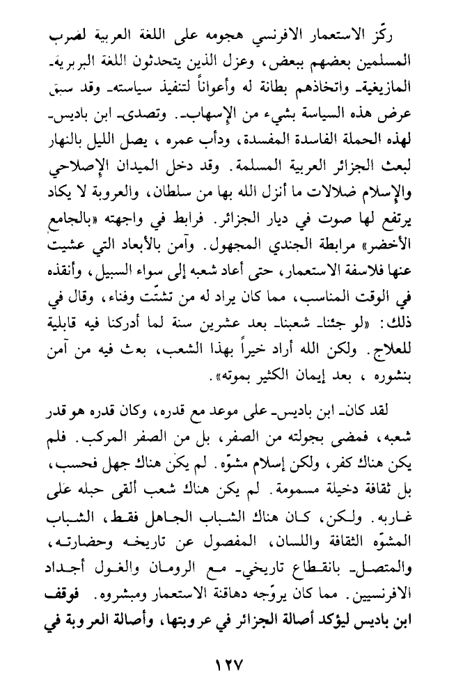 لقد كان - ابن باديس - على موعد مع قدره، وكان قدره هو قدر شعبه، فمضى بجولته من الصفر، بل من الصفر المركب. فلم يكن هناك كفر، ولكن إسلام مشوه. لم يكن هناك جهل فحسب، بل ثقافة دخيلة مسمومة. لم يكن هناك شعب ألقى حبله على غاربه. ولكن، كان هناك الشباب الجاهل فقط، الشباب المشوه الثقافة واللسان، المفصول عن تاريخه وحضارته، والمتصل - بانقطاع تاريخي - مع الرومان والغول أجداد الإفرنسيين. مما كان يروجه دهاقنة الاستعمار ومبشروه. فوقف ابن باديس يؤكد أصالة الجزائر في عروبتها، وأصالة العروبة في