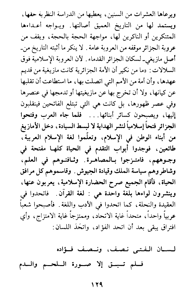 ويرعاها العشرات من السنين، يعطيها من الدراسة النظرية حقها، ويستمد لها من التاريخ العميق أصالتها. ويواجه أعداءها المتنكرين أو الناكرين لها، مواجهة الحجة بالحجة، ويقف من عروبة الجزائر موقفه من العروبة عامة. لا ينكر ما أثبته التاريخ من - أصل مازيغي - لسكان الجزائر القدماء. لأن العروبة الإسلامية فوق السلالات: (ما من نكير أن الأمة الجزائرية كانت مازيغية من قديم عهدها، وأن أمة من الأمم التي اتصلت بها، ما استطاعت أن تقلبها عن كيانها، ولا أن تخرج بها عن مازيغيتها أو تدمجها في عنصرها وفي عصر ظهورها، بل كانت هي التي تبتلع الفاتحين فينقلبون إليها، ويصبحون كسائر أبنائها ... فلما جاء العرب وفتحوا الجزائر فتحا إسلاميا لنشر الهداية لا لبسط السيادة، دخل الأمازيغ من أبناء الوطن في الإسلام، وتعلموا لغة الإسلام العربية، طائعين، فوجدوا أبواب التقدم في الحياة كلها مفتحة في وجوههم، فامتزجوا بالمصاهرة. وثافنوهم في العلم، وشاطروهم سياسة الملك وقيادة الجيوش. وقاسموهم كل مرافق الحياة، فأقام الجميع صرح الحضارة الإسلامية، يعربون عنها، وينشرون لواءها بلغة واحدة هي: لغة القرآن. فاتحدوا في العقيدة والنحلة، كما اتحدوا في الأدب واللغة. فأصبحوا شعبا عربيا واحدا، متحدا غاية الاتحاد، وممتزجا غاية الامتزاج، وأي افتراق يبقى بعد أن اتحد الفؤاد، واتحد اللسان: