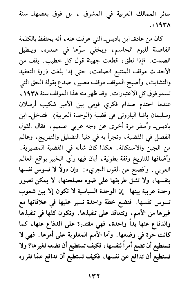 كان من عادة - ابن باديس - التي عرفت عنه، أنه يحتفظ بالكلمة الفاصلة لليوم الحاسم، ويخفي سرها في صدره، ويطيل الصمت. فإذا نطق، قطعت جهينة قول كل خطيب. يقف من الأحداث موقف المتتبع الصامت، حتى إذا بلغت ذروة التعقيد والتشابك، وأصبح الموقف موقف مصير، صدع بقولة الحق التي تسمو فوق كل الاعتبارات. وقد ظهر منه هذا الموقف سنة 1938، عندما احتدم صدام فكري قومي بين الأمير شكيب أرسلان وسليمان باشا الباروني في قضية (الوحدة العربية). فتدخل - ابن باديس - وأسفر مرة أخرى عن وجه عربي صميم، فقال القول الفصل في القضية، وتجرأ به في دنيا التضليل والتهريج، وعالم من الجبن والاستكانة. هكذا كان شأنه في القضية المصيرية. وأضافها للتاريخ وقفة بطولية، أبان فيها رأي الخبير بواقع العالم العربي. وأفصح عن القول الجريء: (إن دولا لا تسوس نفسها بنفسها، ولا تشق طريقها على ضوء مصلحتها، لا يمكن تصور وحدة عربية بينها. إن الوحدة السياسية لا تكون إلا بين شعوب تسوس نفسها. فتضع خطة واحدة تسير عليها في علاقاتها مع غيرها من الأمم: وتتعاقد على تنفيذها، وتكون كلها في تنفيذها والدفاع عنها يدا واحدة، فهي مقتدرة على الدفاع عنها، كما كانت حرة في وضعها. وأما الأمم المغلوبة على أمرها. فهي لا تستطيع أن تضع أمرا لنفسها، فكيف تستطيع أن تضعه لغيرها؟ ولا تستطيع أن تدافع عن نفسها، فكيف تستطيع أن تدافع عما تقرره