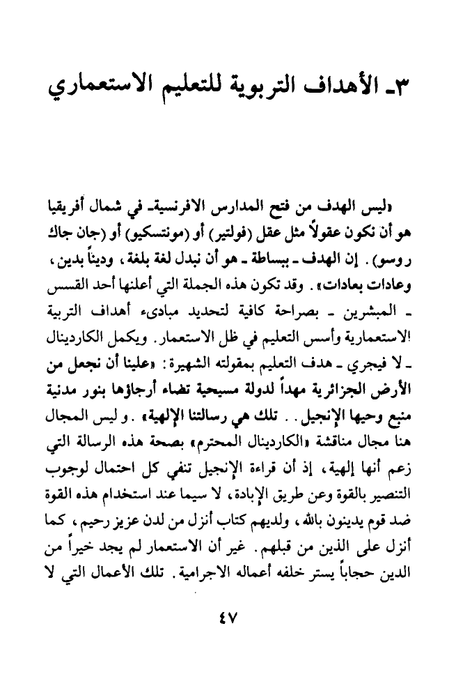 (ليس الهدف من فتح المدارس الإفرنسية - في شمال أفريقيا هو أن تكون عقولا مثل عقل (فولتير) أو (مونتسكيو) أو (جان جاك روسو). إن الهدف - ببساطة - هو أن نبدل لغة بلغة، ودينا بدين، وعادات بعادات). وقد تكون هذه الجملة التي أعلنها أحد القسس - المبشرين - بصراحة كافية لتحديد مبادىء أهداف التربية الاستعماري وأسس التعليم في ظل الاستعمار. ويكمل الكاردينال - لافيجري - هدف التعليم بمقولته الشهيرة: (علينا أن نجعل من الأرض الجزائرية مهدا لدولة مسيحية تضاء أرجاؤها بنور مدنية منبع وحيها الإنجيل .. تلك هي رسالتنا الإلهية). وليس المجال هنا مجال مناقشة (الكاردينال المحترم) بصحة هذه الرسالة التي زعم أنها إلهية، إذ أن قراءة الإنجيل تنفي كل احتمال لوجوب التنصير بالقوة وعن طريق الإبادة، لا سيما عند استخدام هذه القوة ضد قوم يدينون بالله، ولديهم كتاب أنزل من لدن عزيز رحيم، كما أنزل على الذين من قبلهم. غير أن الاستعمار لم يجد خيرا من الدين حجابا يستر خلفه أعماله الإجرامية. تلك الأعمال التي لا